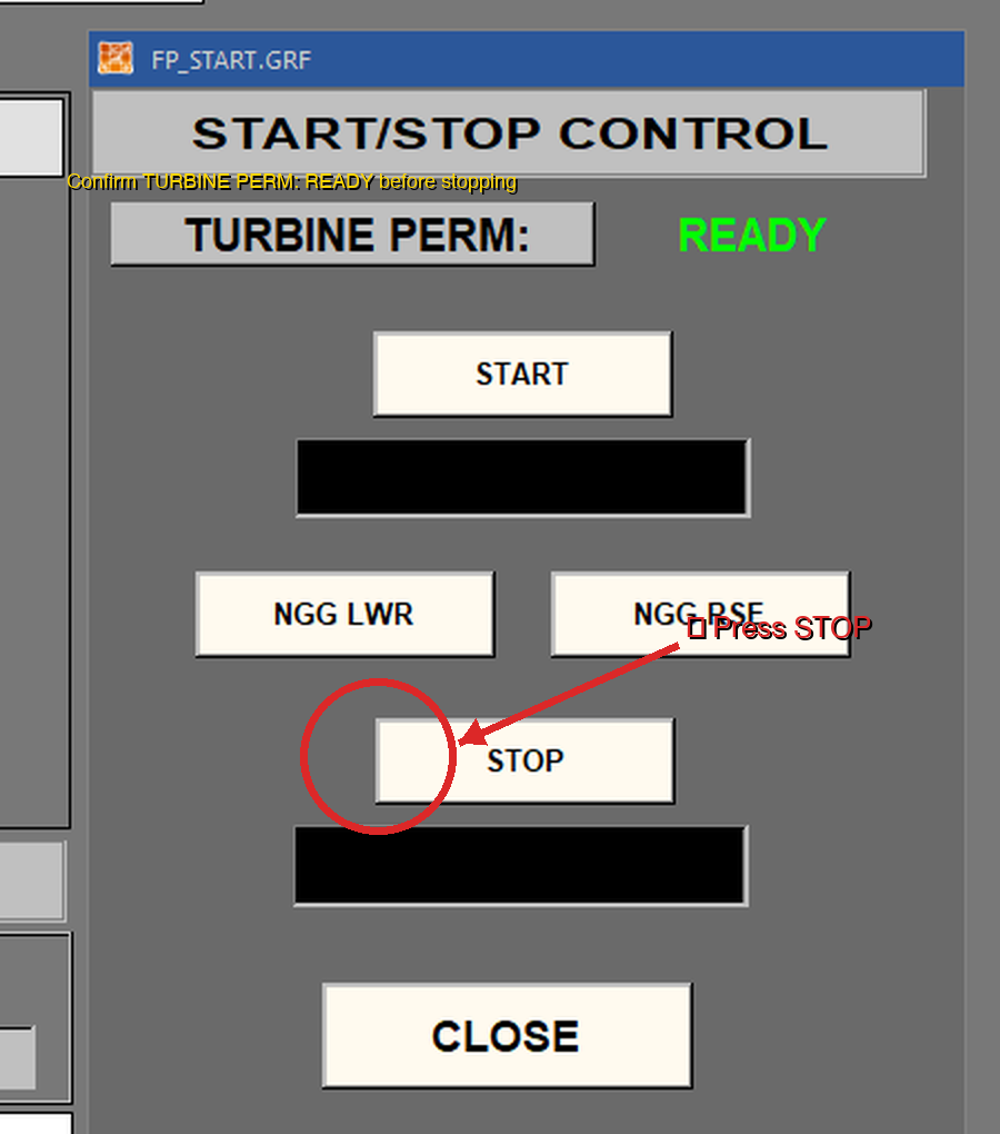 Select STOP on the Turbine Start/Stop screen.
