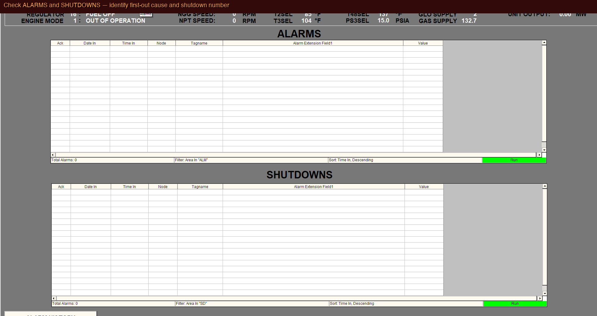 On HMI, open alarm/trip list and identify the first (root cause) trip. Do not clear trips blindly.